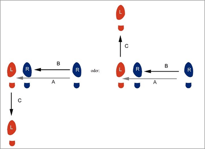 3. Neue Richtung - Vorwärts oder Rückwärts (der 3. Galoppschritt ändert die Richtung, und wird zum Passgangschritt)